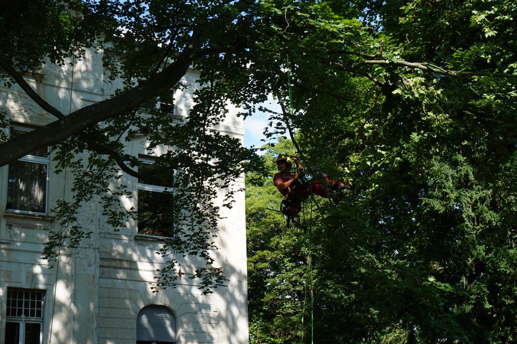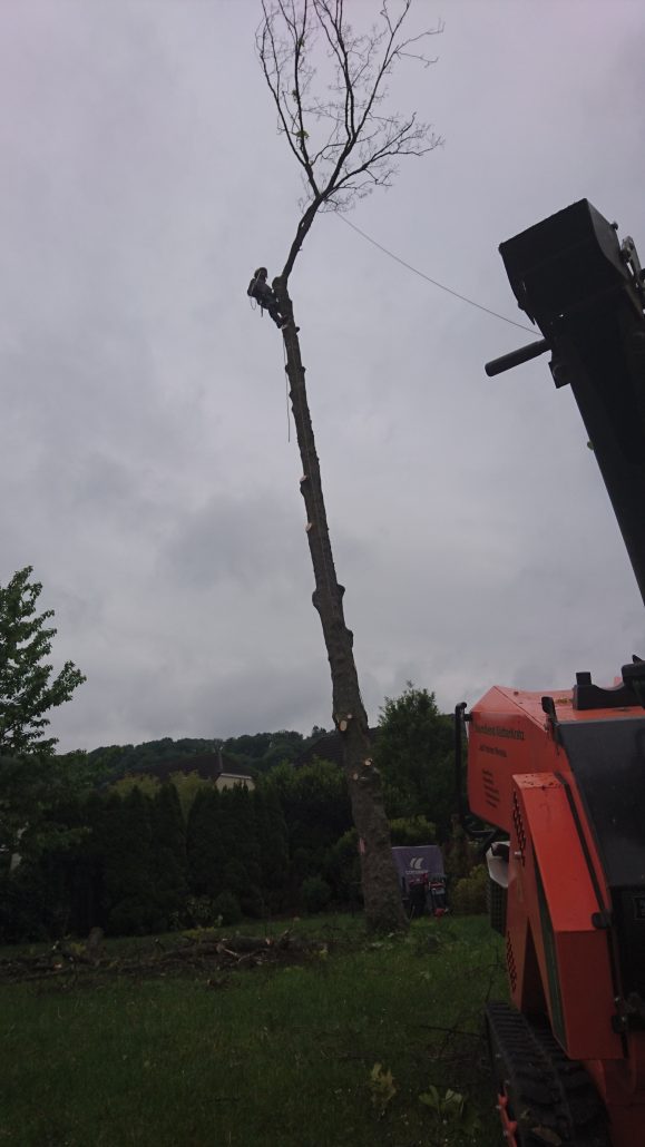 - Gefahrenfällung, Bäume sind aufgrund des Standortes oder ihrer Größe nicht vom Boden aus zu fällen, hierbei bedienen wir uns der Seilklettertechnik und tragen den Baum stückweise ab. Unabhängig vom baulichem Untergrund, werden Bestandteile des Baumes kontrolliert zu Boden gelassen.